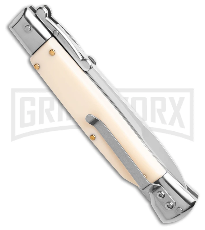 This blade boasts acrylic ivory scales over stainless steel frames and liners. This comes with a case.