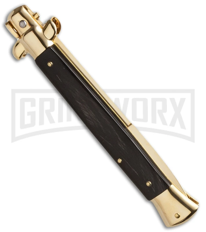 Frank B. 11″ Italian Stiletto Dark Horn Automatic Knife – Gold Bayonet
