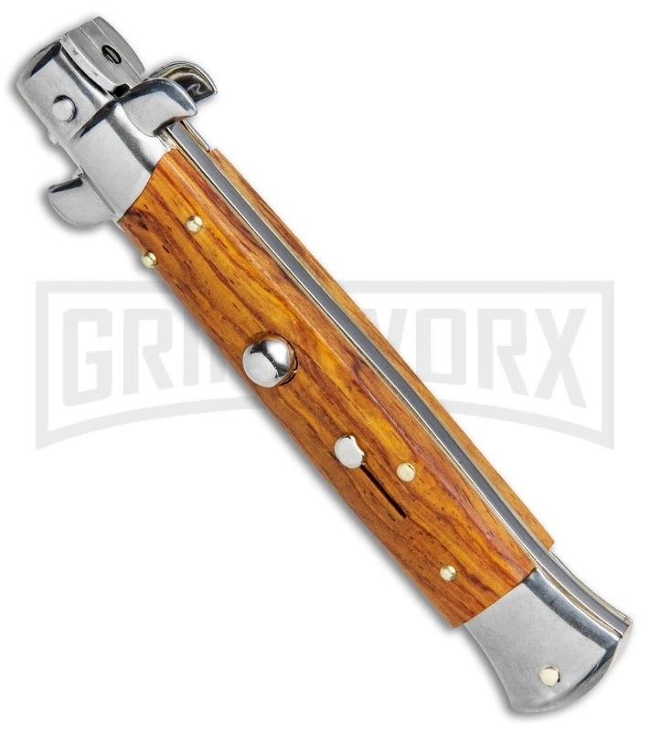 This classically designed Italian stiletto features authentic Cocobolo handle scales and a stainless steel kris style blade. It has fast automatic action and lock-up from the push button, and protection against accidental release with a sliding safety. Polished bolsters and hardware add an elegant touch to the handle. This Frank B Stiletto will make a beautiful addition to your Italian auto collection.