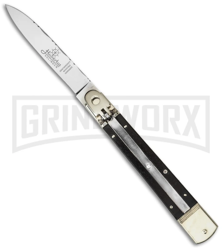 This beautiful leverlock automatic knife was handcrafted in Solingen Germany. It has rustic ebony wood handle scales with nickle silver bolsters, pins, and lever lock. The stainless steel blade comes in a drop point style with a polished mirror finish. Intricate filework runs along the spine of the blade, adding a custom appearance to the knife.