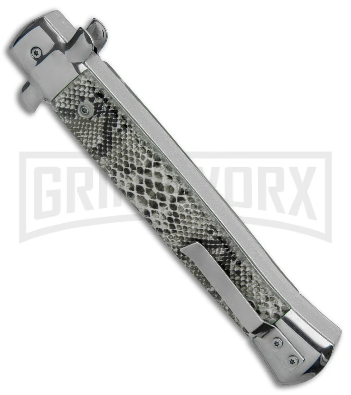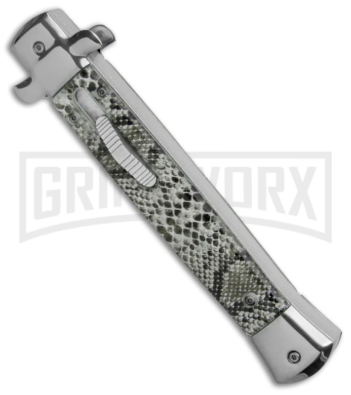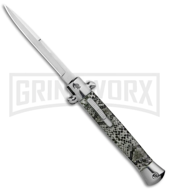 Get the best of both worlds with the Mago 9″ Italian Stiletto OTF automatic. The Mago brilliantly combines the classic style of an Italian stiletto and the tactical speed of an OTF. A front loaded thumb slide fires and retracts the blade with smooth automatic precision. Add a unique design to your collection with the Mago 9″ Italian Stiletto OTF Auto.