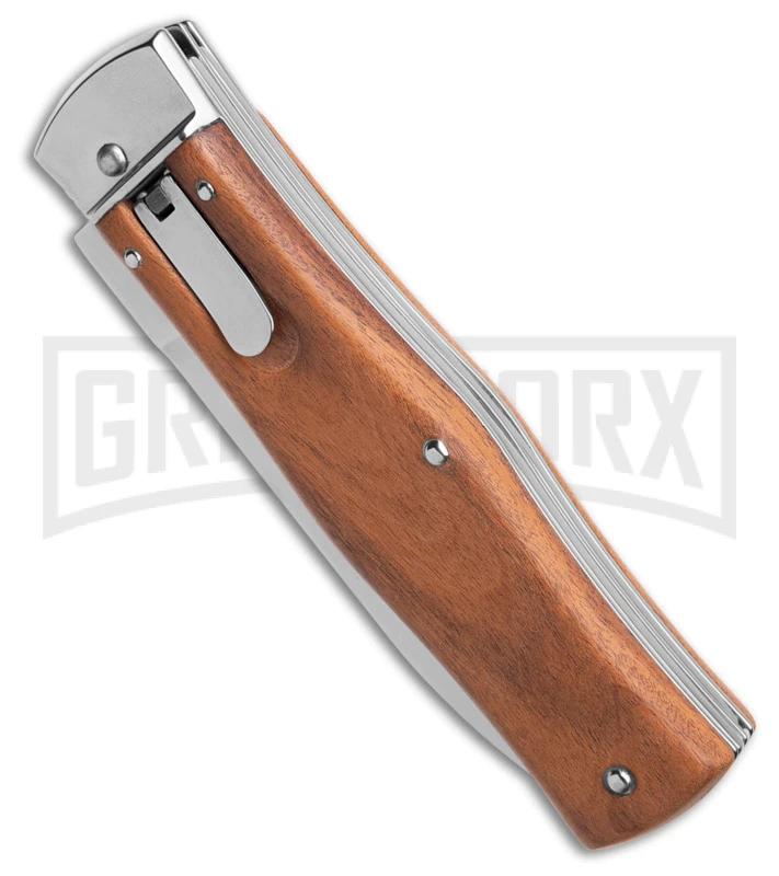 This Mikov Predator 241 has a satin dagger blade, a wood handle, a pocket clip, and an additional saw blade.